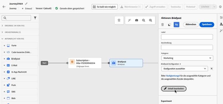 Sobald Ihre Direkt-Mail-Konfiguration bereit ist, können Sie Ihrer Journey eine Direkt-Mail-Aktion hinzufügen.