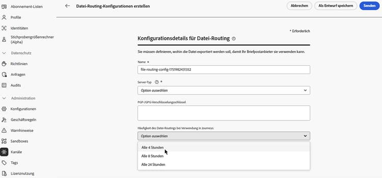 Wenn Ihre Datei-Routing-Konfiguration mit Journeys gesendet wird, können Sie die Häufigkeit festlegen, mit der die Datei an den Server gesendet wird.