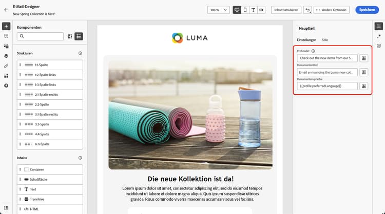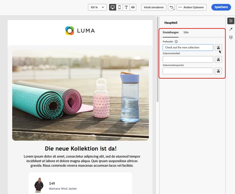Geben Sie auf der Registerkarte Einstellungen Text in die Felder Preheader, Dokumententitel und/oder Dokumentensprache ein.