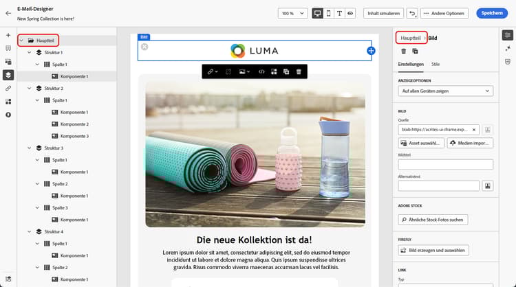 Fügen Sie im E-Mail-Designer mindestens eine Strukturkomponente hinzu, um mit der E-Mail-Gestaltung zu beginnen.
