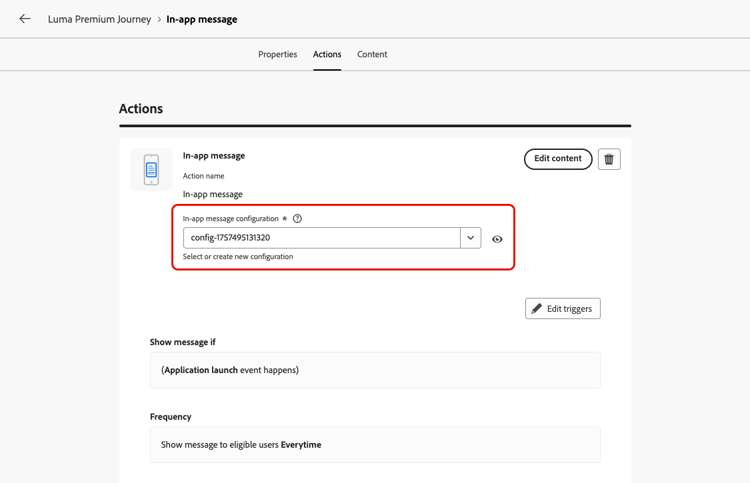 Sie werden zur Registerkarte Aktionen geleitet. Wählen oder erstellen Sie von dort aus die zu verwendende In-App-Konfiguration. Weitere Informationen