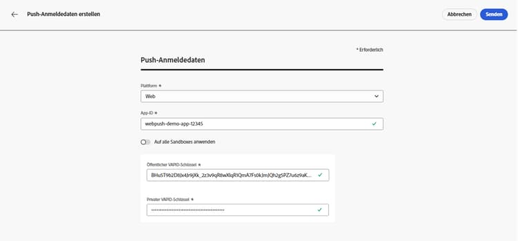 Geben Sie Ihren öffentlichen VAPID-Schlüssel und Ihren privaten Schlüssel ein.