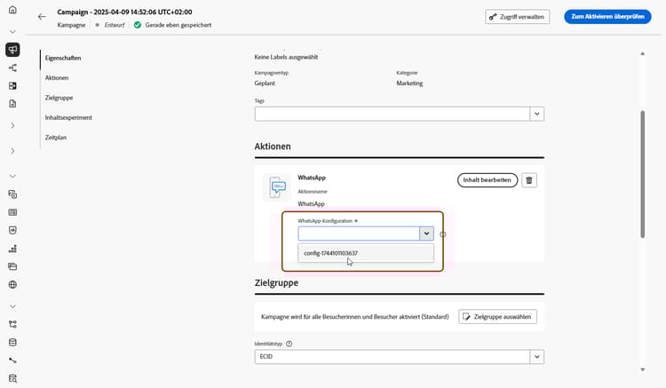 Wählen Sie im Abschnitt Aktionen die Option WhatsApp und dann eine Konfiguration aus oder erstellen Sie eine neue Konfiguration.