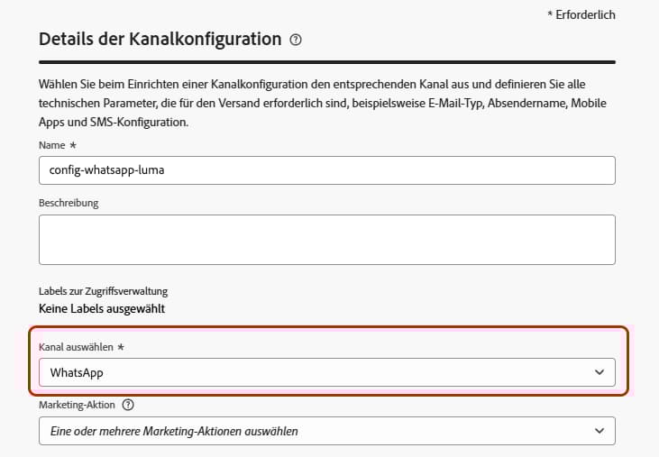 Geben Sie einen Namen und eine Beschreibung (optional) für die Konfiguration ein und wählen Sie dann den WhatsApp-Kanal aus.