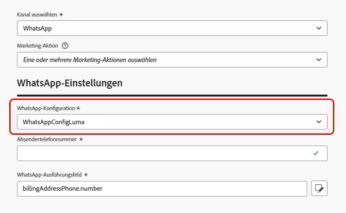 Wählen Sie Abschnitt WhatsApp-Einstellungen die zuvor erstellte WhatsApp-Konfiguration aus.