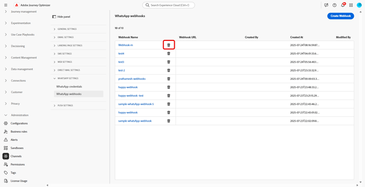 >Kanäle, wählen Sie das Menü WhatsApp-Webhooks unter WhatsApp-Einstellungen aus und klicken Sie auf die Schaltfläche Webhook erstellen.