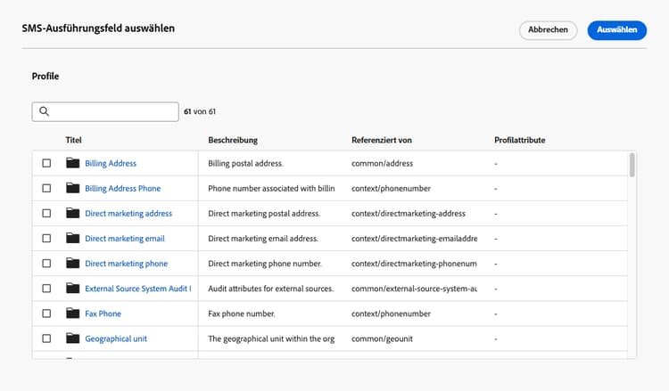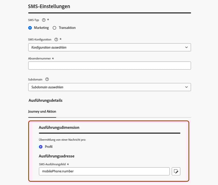 In diesem Fall nutzt Journey Optimizer Ausführungsfelder, um zu bestimmen, welche E-Mail-Adresse oder Telefonnummer vom Profildienst vorrangig verwendet werden soll.