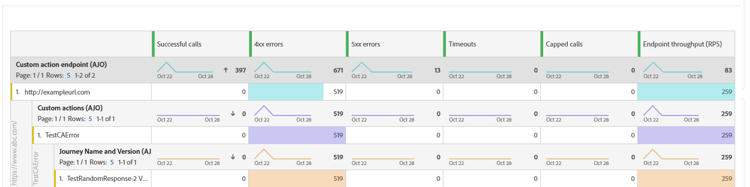 Auf Berichtseite Benutzerdefinierte Aktion“ können Sie die Zuverlässigkeit und Leistung von API-Aufrufen von Ihren Journey an Drittanbietersysteme überwachen. Diese Berichte helfen Ihnen dabei, Integrationsprobleme, Latenzengpässe oder Einschränkungs-/Begrenzungsbeschränkungen, die sich auf die Bereitstellung auswirken können, schnell zu identifizieren.