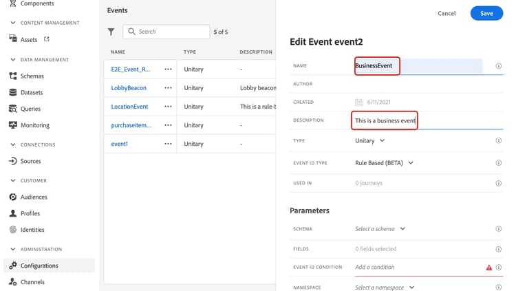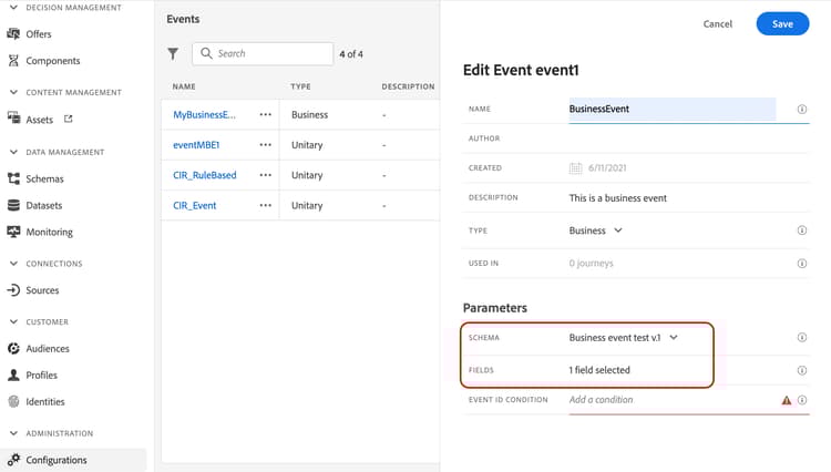 Das Ereignis ist jetzt konfiguriert und kann in einer Journey abgelegt werden. Für den Empfang von Ereignissen sind zusätzliche Konfigurationsschritte erforderlich. Weitere Informationen finden Sie auf dieser Seite.