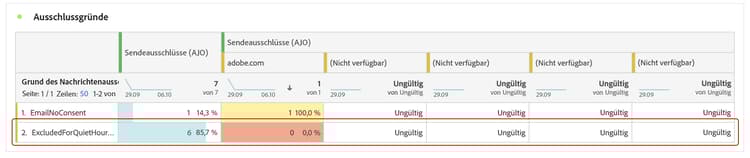 Sobald Ihre Journeys oder Kampagnen aktiviert und ausgeführt wurden, können Sie die Anzahl der vom Versand ausgeschlossenen Profile im Customer Journey Analytics-Bericht und im Live-Bericht anzeigen. Dort werden die Regeln für Ruhezeiten als möglicher Grund für den Ausschluss von Benutzenden vom Versand aufgeführt.