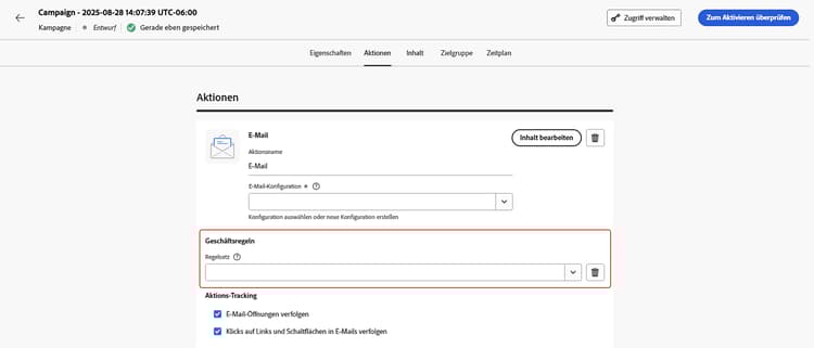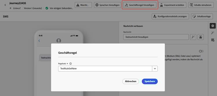 Nachdem die Regel gespeichert und der Regelsatz aktiviert wurde, können Sie sie auf Aktionen in Journeys und Kampagnen anwenden. Unterstützte Kanäle: E-Mail, SMS, Push, WhatsApp. Weitere Details finden Sie in den Registerkarten unten.