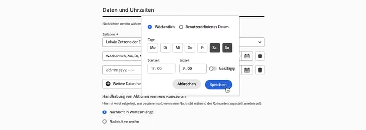 Ruhezeiten ermöglichen die Definition zeitbasierter Ausschlüsse für den E-Mail-, SMS-, Push- und WhatsApp-Kanal. Sie stellen sicher, dass während bestimmter Zeiträume keine Nachrichten gesendet werden, und helfen Ihnen so, Kundenpräferenzen und Compliance-Anforderungen zu erfüllen.