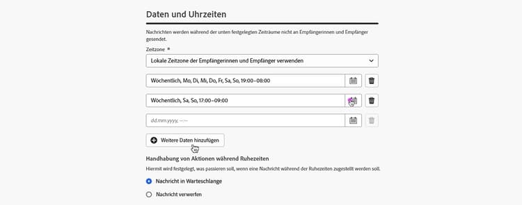 Definieren Sie Abschnitt Datum und Uhrzeit, wann Ruhezeiten angewendet werden sollen: