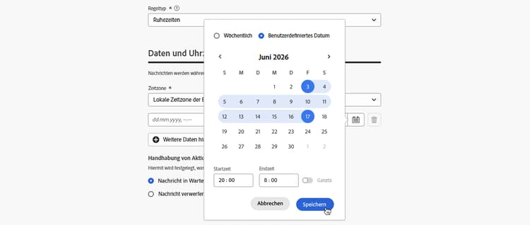 Benutzerdefiniertes Datum: Wählen Sie bestimmte Daten im Kalender und ein Zeitfenster aus. Sie können die Regel auch den ganzen Tag durchsetzen (diese Option ist nur für bis zu 3 aufeinander folgende Tage verfügbar).
