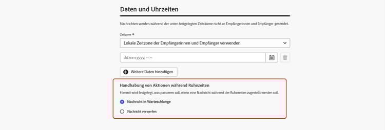 Ruhezeiten können über Regelsätze angewendet werden, die zur präzisen Steuerung Einzelaktionen in Kampagnen oder Journeys zugewiesen werden können.