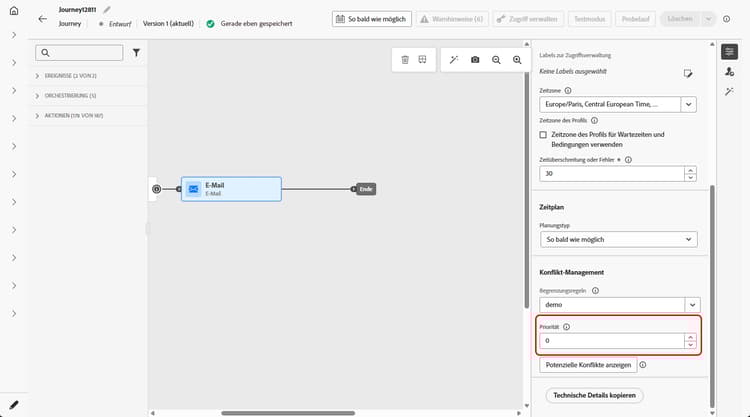 Im Abschnitt Konflikt-Management ist die Option Journey-Priorität verwenden standardmäßig aktiviert, was bedeutet, dass der Prioritätswert für die Aktion vom Gesamtprioritätswert für die Journey übernommen wird.