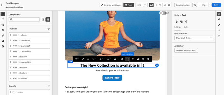 Wählen Sie in der E-Mail-Designer die Komponente aus, die Sie personalisieren möchten, und klicken Sie an der Stelle, an der Sie den Ausdruck einfügen möchten.