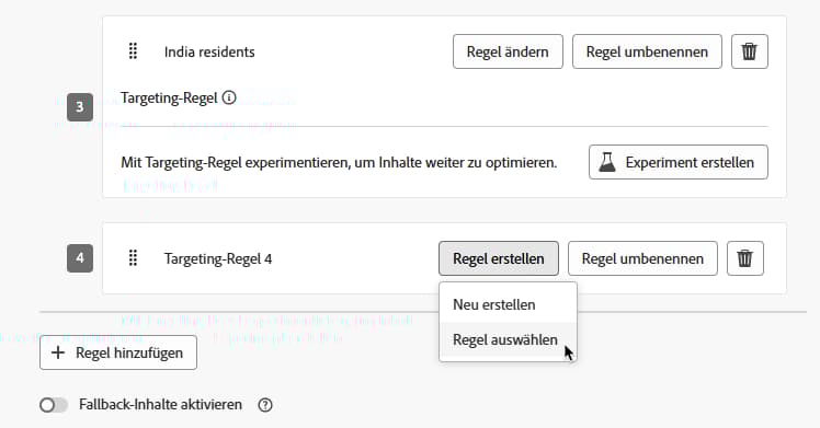 Wählen Sie nach Bedarf Fallback-Inhalte aktivieren aus. Mit Fallback-Inhalten kann Ihre Zielgruppe einen Standardinhalt erhalten, falls keine der Targeting-Regeln erfüllt ist.