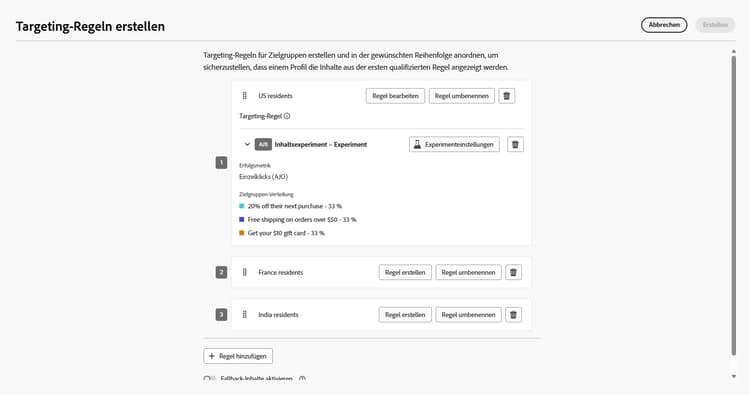 Sobald das Experiment definiert ist, gilt es nur für die erste Targeting-Regel.