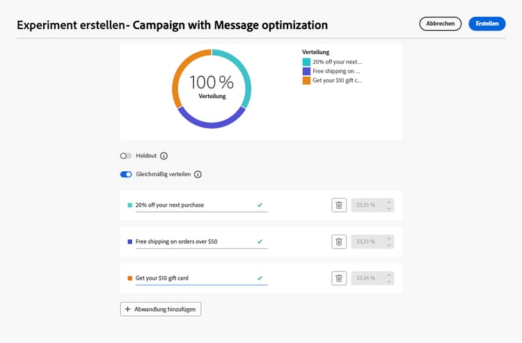 Sobald das Experiment definiert ist, gilt es für alle Aktionen, die in dieser Kampagne oder über die Aktivität Aktion der Journey eingefügt wurden, d. h. dieselben Kundinnen und Kunden sehen auf allen Oberflächen dieselben Angebote.