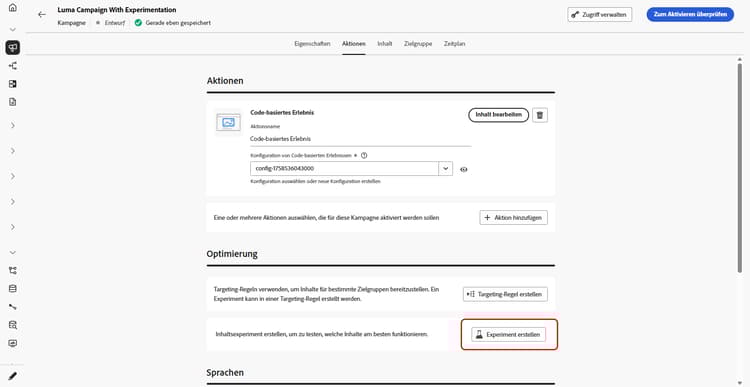 Wählen Sie im Abschnitt Optimierung die Option Experiment erstellen aus.