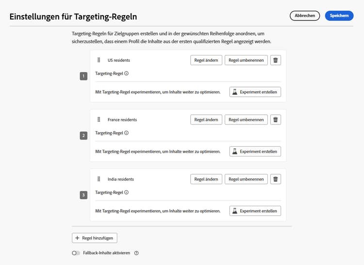 Wählen Sie nach Bedarf Fallback-Inhalte aktivieren aus. Mit Fallback-Inhalten kann Ihre Zielgruppe einen Standardinhalt erhalten, falls keine der Targeting-Regeln erfüllt ist.