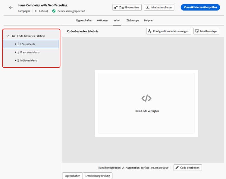 Sobald die Journey/Kampagne live ist, werden für jede Zielgruppe maßgeschneiderte Inhalte versendet, sodass etwa in den USA ansässige Personen eine bestimmte Nachricht erhalten, in Frankreich ansässige Personen eine andere usw.