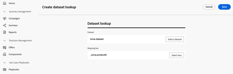 Um Attribute aus Adobe Experience Platform für die Entscheidungsfindung zu verwenden, müssen Sie eine Zuordnung erstellen, um zu definieren, wie der Adobe Experience Platform-Datensatz mit Daten in Journey Optimizer verbunden wird. Gehen Sie dazu wie folgt vor: