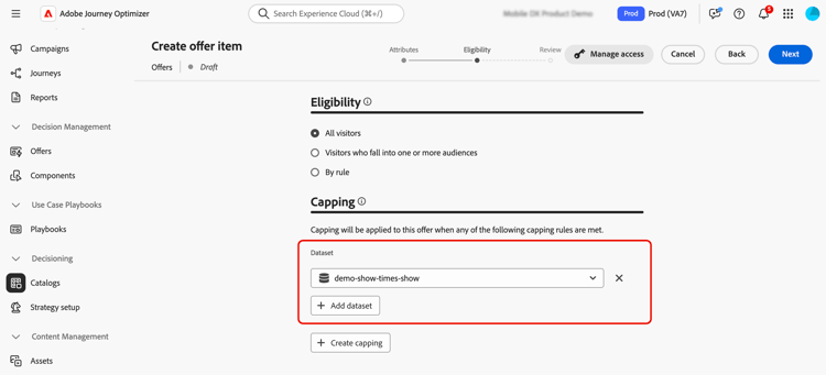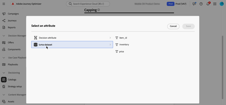 Beispielsweise kann ein Einzelhändler ein Angebot auf der Grundlage des Echtzeit-Produktinventars begrenzen. Anstatt einen festen Schwellenwert von 500 festzulegen, verwendet er einen Ausdruck, der aus einem Adobe Experience Platform-Datensatz auf das Feld inventory_count verweist. Wenn der Datensatz zeigt, dass noch 275 Artikel auf Lager sind, wird das Angebot nur bis zu dieser Zahl zugestellt.