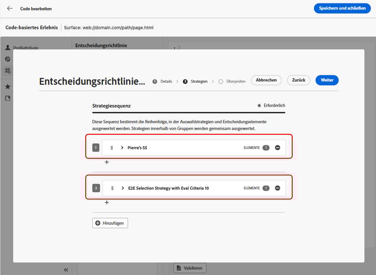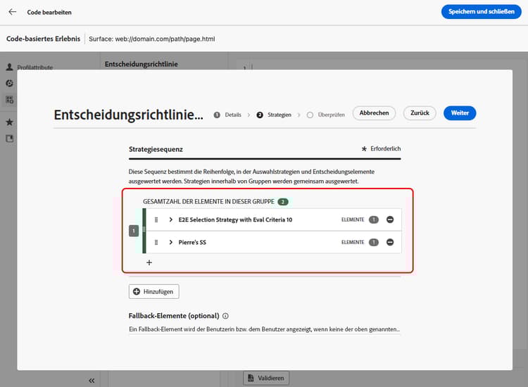 note note NOTE Nur Auswahlstrategien können per Drag-and-Drop innerhalb einer Sequenz verschoben werden. Um die Position eines Entscheidungselements zu ändern, müssen Sie es entfernen und mithilfe der Schaltfläche Hinzufügen wieder hinzufügen, nachdem Sie die anderen Elemente hinzugefügt haben, die vorher ausgewertet werden sollen. Sie können auch mehrere Auswahlstrategien in Gruppen kombinieren, sodass sie zusammen und nicht getrennt ausgewertet werden. Klicken Sie dazu unter einer Auswahlstrategie auf die Schaltfläche