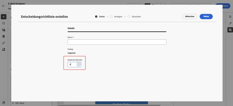 Für den E-Mail-Kanal ist das Feld Anzahl von Elementen standardmäßig auf 1 festgelegt und kann nur geändert werden, wenn die Entscheidungsrichtlinie von innerhalb einer Komponente des Typs Wiederholungsraster hinzugefügt wird. Erweitern Sie den folgenden Abschnitt, um weitere Informationen zu erhalten:
