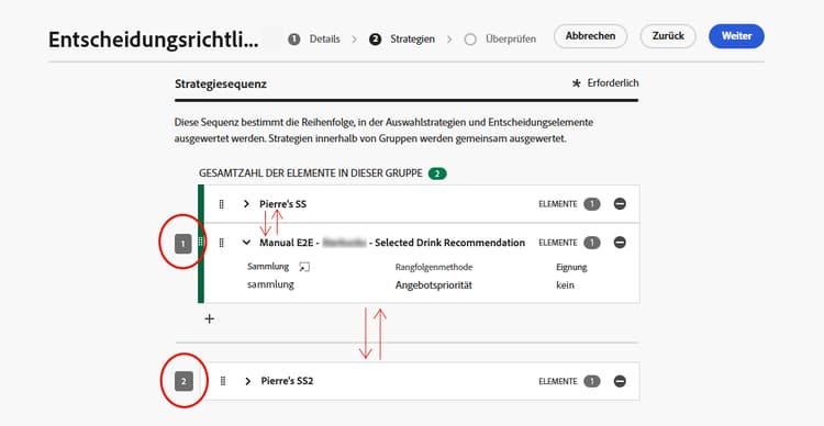 Wenn mehrere Entscheidungselemente und/oder Strategien hinzugefügt werden, werden diese in einer bestimmten Reihenfolge ausgewertet. Das erste Objekt, das der Sequenz hinzugefügt wurde, wird zuerst ausgewertet und die Auswertung wird in dieser Reihenfolge fortgeführt. Die Objekte und/oder Gruppen können nach Bedarf per Drag-and-Drop verschoben werden, um die Standardsequenz zu ändern. Erweitern Sie den folgenden Abschnitt, um weitere Informationen zu erhalten.