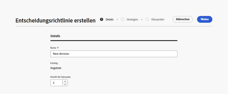 Geben Sie einen Namen für die Entscheidungsrichtlinie an und wählen Sie einen Katalog aus (derzeit beschränkt auf den Standardkatalog Angebote).