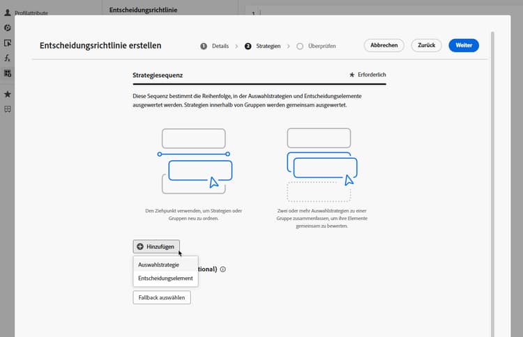 Klicken Sie im Abschnitt Strategiesequenz auf die Schaltfläche Hinzufügen und wählen Sie Auswahlstrategie. Weitere Informationen