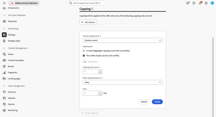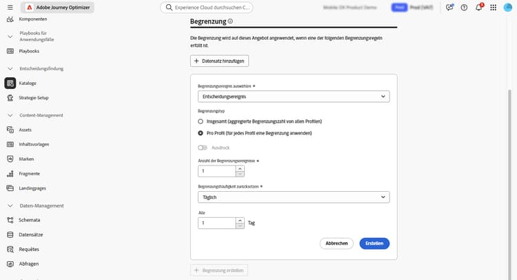Mit Begrenzungen wird definiert, wie oft ein Angebot maximal angezeigt werden kann. Durch die Begrenzung der Anzeige von Angeboten vermeiden Sie, dass Ihre Kundinnen und Kunden übermäßig umworben werden, und können jeden Touchpoint mit dem besten Angebot optimieren. Sie können bis zu 10 Begrenzungen für ein bestimmtes Entscheidungselement erstellen.
