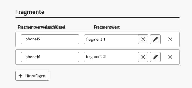 note availability AVAILABILITY Fragmente in Entscheidungselementen sind derzeit nur für eine ausgewählte Gruppe von Organisationen verfügbar (eingeschränkte Verfügbarkeit). Weitere Informationen erhalten Sie beim Adobe-Support. Wählen Sie im Abschnitt Fragmente die veröffentlichten Fragmente aus, die Sie verwenden möchten, und weisen Sie ihnen einen Referenzschlüssel zu. Sie können diese Fragmente dann in Ihren Entscheidungsrichtlinien nutzen. Weitere Informationen