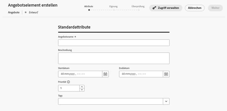 Mit Journey Optimizer können Sie Marketing-Angebote erstellen, die als Entscheidungselemente bezeichnet werden, und in einem zentralen Katalog und in Sammlungen organisieren. Sie bestehen aus standardmäßigen und benutzerdefinierten Attributen, die genau auf Ihre Bedürfnisse abgestimmt sind. Darüber hinaus enthalten sie Profileinschränkungen, mit denen Sie definieren können, wem ein Entscheidungselement angezeigt werden kann.