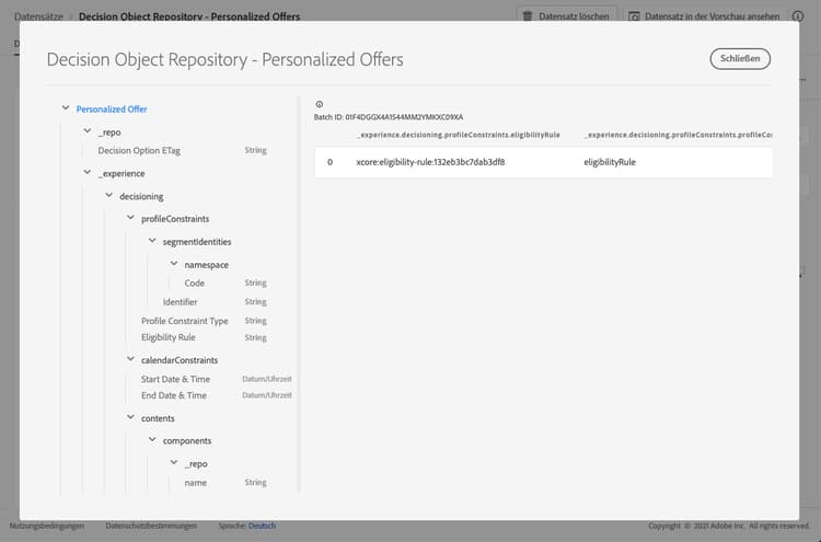 Im Folgenden finden Sie eine Liste aller Felder, die im Datensatz Entscheidungsobjekt-Repository – Personalisierte Angebote verwendet werden können.