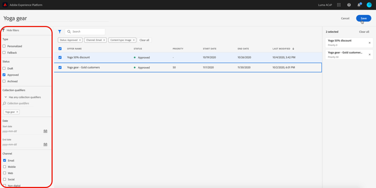 Um eine statische Sammlung zu erstellen, verwenden Sie den linken Bereich zum Filtern der Liste der Angebote (nach Status, Sammlungsqualifizierer, Datum, Kanal, Inhaltstyp) und wählen Sie dann die Angebote aus, die der Sammlung hinzugefügt werden sollen.