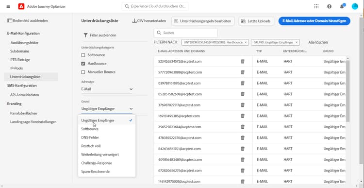 - Eine Unterdrückungsliste besteht aus E-Mail-Adressen, die Sie von Ihren Sendungen ausschließen möchten, da das Senden an diese Kontakte Ihren Ruf als Versender und Ihre Versandraten beeinträchtigen könnte. Sie können alle E-Mail-Adressen überwachen, die bei einer Journey automatisch vom Versand ausgeschlossen werden, wie ungültige Adressen, Adressen, die stets zu Soft-Bounces führen und sich negativ auf Ihre E-Mail-Reputation auswirken könnten, sowie Empfänger, die eine Spam-Beschwerde gegen eine Ihrer E-Mail-Nachrichten eingelegt haben. Erfahren Sie, wie Sie die Unterdrückungsliste und weitere Zustellversuche verwalten.