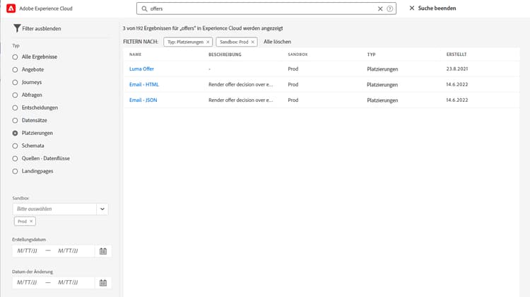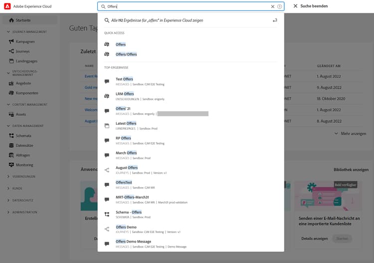 Sie können auf der Benutzeroberfläche von Adobe Journey Optimizer die einheitliche Adobe Experience Cloud-Suche in der Mitte der oberen Leiste verwenden, um Assets, Journeys, Datensätze und mehr in Ihren Sandboxes zu finden.