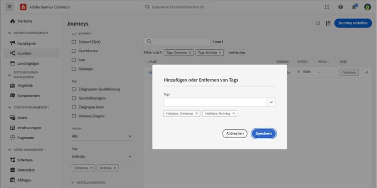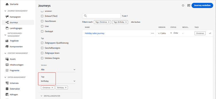 Darüber hinaus können Sie einheitliche Tags verwenden, um eine Liste nach den einem Objekt zugewiesenen Tags zu filtern. Aktuell sind Tags für Journeys und Kampagnen verfügbar. Erfahren Sie, wie Sie mit Tags arbeiten.