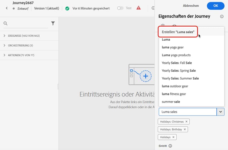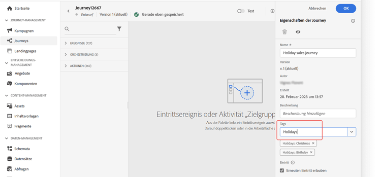 Mit einheitlichen Tags in Adobe Experience Platform können Sie Ihre Journey Optimizer-Objekte einfach klassifizieren, um die Suche über Listen zu verbessern.