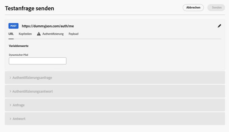 Um die Funktion Testanfrage senden verwenden zu können, muss eine benutzerdefinierte Aktion mit einer URL, Headern und Authentifizierungseinstellungen vorkonfiguriert werden.
