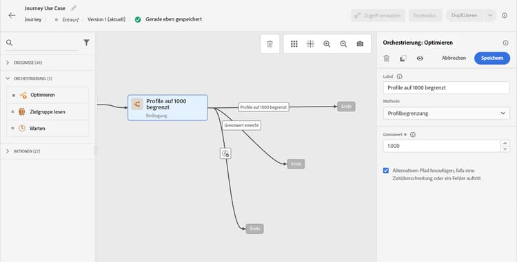 Mit Bedingungen können Sie festlegen, wie Einzelpersonen Ihre Journey durchlaufen, indem Sie mehrere Pfade basierend auf bestimmten Kriterien erstellen. Sie können auch einen alternativen Pfad konfigurieren, um mit Timeouts oder Fehlern umzugehen und so ein nahtloses Erlebnis sicherzustellen.