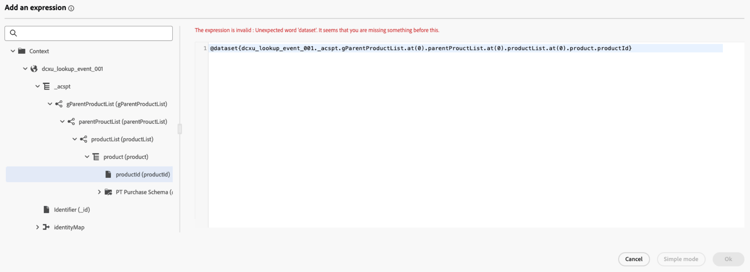 code language-none @event{purchase_event.products.all( in(currentEventField.sku, @datasetlookup{MyDatasetLookupActivity1.entities.all(currentDatasetLookupField.category == 'household').sku} ) )}