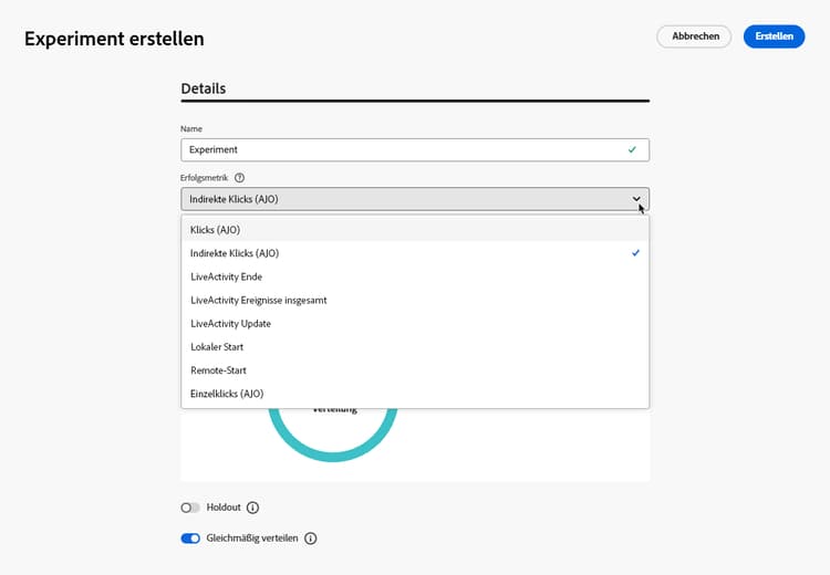 Wählen Sie die Erfolgsmetrik, die Sie für Ihr Experiment festlegen möchten. Weitere Informationen zu den verfügbaren Metriken und zur Konfiguration der Liste finden Sie in diesem Abschnitt.