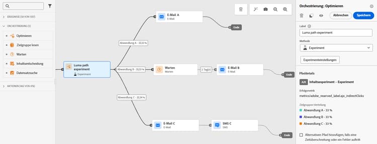 Mit Experimenten können Sie verschiedene Pfade auf der Grundlage einer zufälligen Aufteilung testen, um anhand vordefinierter Erfolgsmetriken zu ermitteln, welcher Pfad am besten funktioniert.