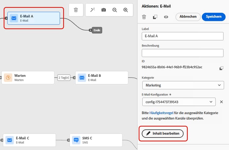 - einen zweiten Pfad mit einem Warteknoten von zwei Tagen und einer E-Mail,