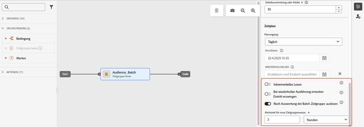 Wenn die Option Nach Auswertung der Batch-Zielgruppe auslösen ausgewählt ist, sucht Journey Optimizer nach einer neuen Zielgruppenauswertung. Als Startpunkt für den Lookback-Zeitraum verwendet das System die Zeit der letzten erfolgreichen Journey-Ausführung, auch wenn diese mehr als 24 Stunden zurückliegt. Dies ist für Journeys vom Typ „Inkrementelles Lesen“ von Bedeutung, die in der Regel über einen 24-stündigen Lookback-Zeitraum verfügen.